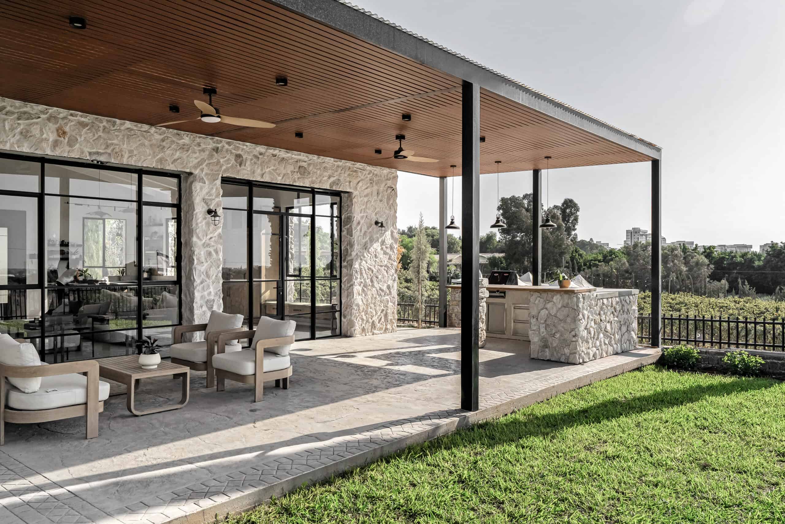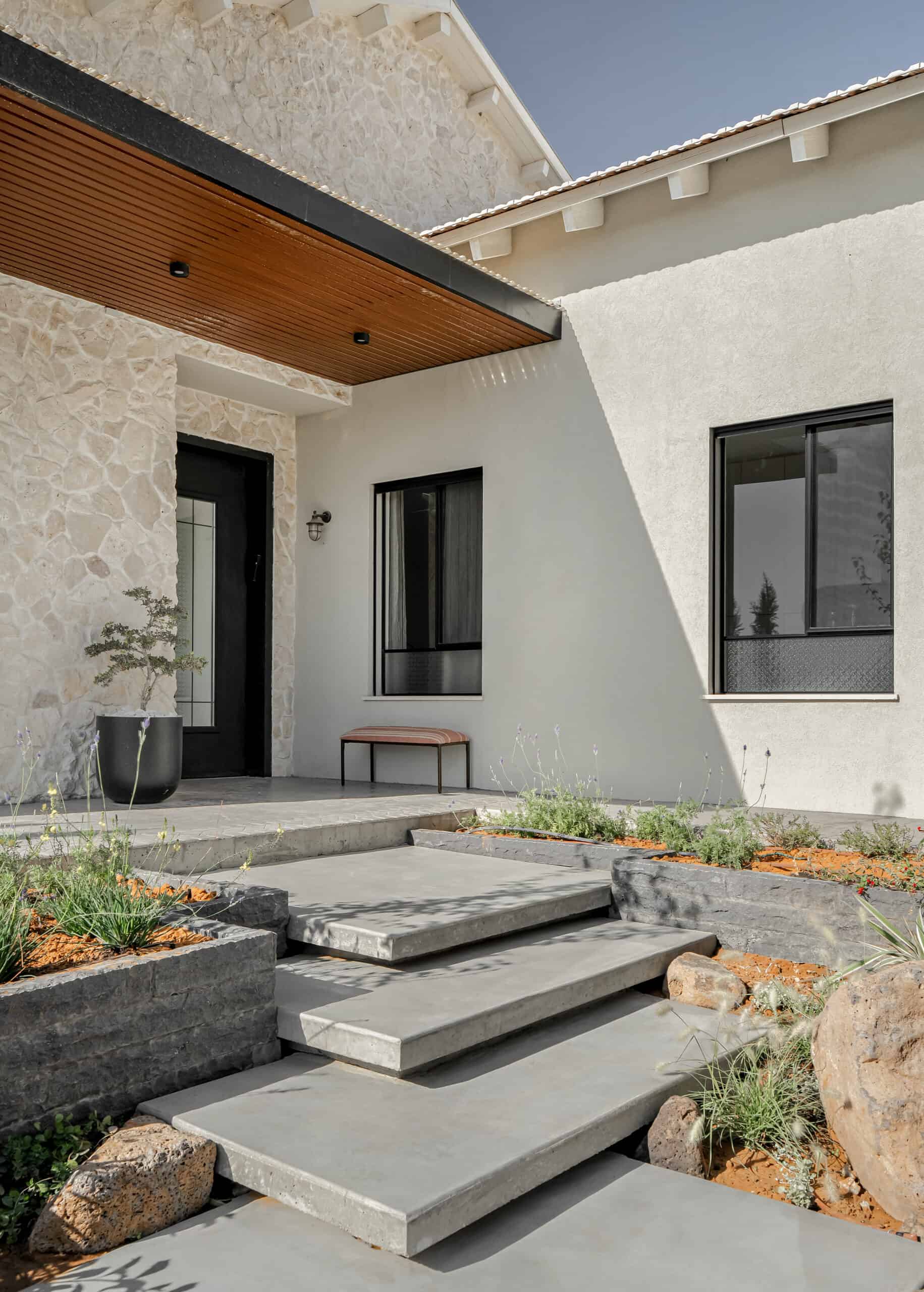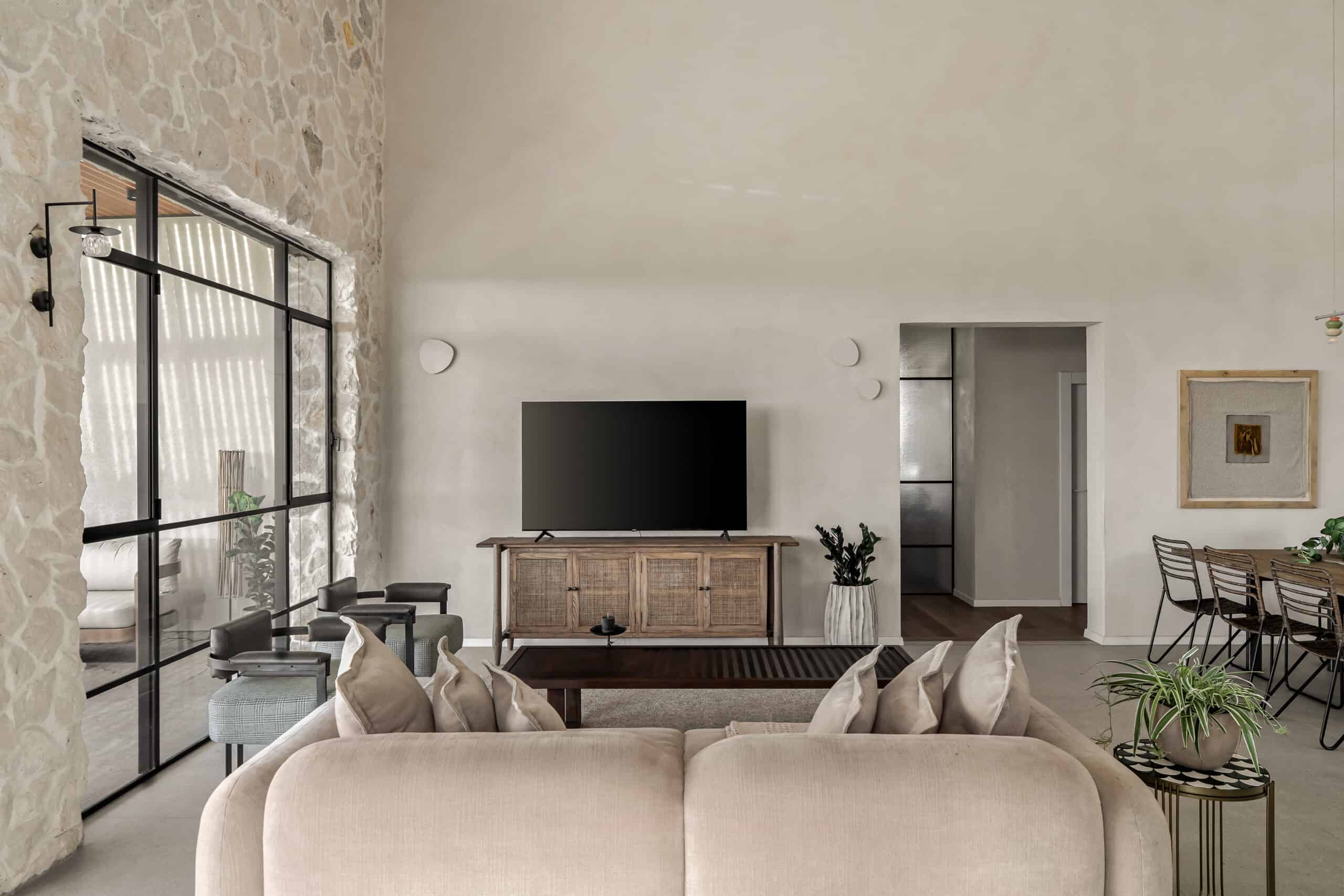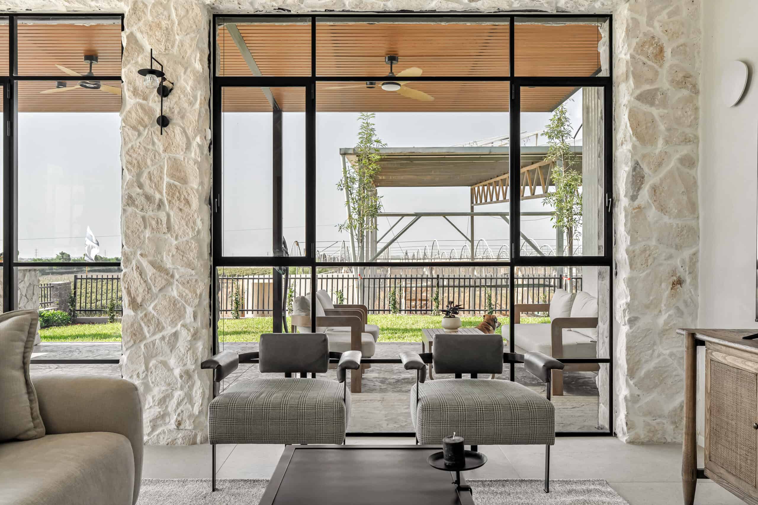 בחרנו בטבע, בחומר, גולמי ככל שניתן. אבן, עץ, טיח מינרלי, בדים טבעיים, אמנות מקומית שנעשו כולם באהבה, בין סבבי מילואים, בין מלחמה לתקומה.